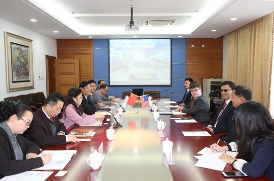 叶银忠介绍了我校的历史沿革、学生规模、学科设置、国际交流合作情况,表示我校十分重视国际化发展,正积极拓展对外交流与合作的深度和广度,希望通过与德州大学圣安东尼奥分校的交流合作借鉴其优势专业的课程设置教学法方面的经验,欢迎更多的德州师生来我校交流访问。雷恩·森特诺介绍了德州大学圣安东尼奥分校近年来侧重工程专业领域的发展,并注重发展与中国大学的国际交流与合作,我校独有的行业特色、良好的发展前景和优美的校园环境给他留下了深刻印象,他希望两校进一步深入交流,相互学习借鉴并欢迎我校师生来美国研修深造。双方详细讨论了加强两校国际交流合作的发展计划,包括进一步推动双方教师学术交流互派,学生交流及在网络安全专业开展合作项目等事宜。
