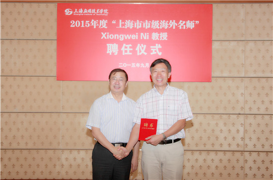 9月8日上午,市级“海外名师”聘任仪式在奉贤校区图书馆贵宾厅举行。英国赫瑞瓦特大学Xiongwei Ni教授受聘为我校2015学年度上海市市级“海外名师”。校长刘宇陆出席聘任仪式,并为Xiongwei Ni教授颁发聘书。化学与环境工程学院和国际交流处相关负责人参加了聘任仪式。