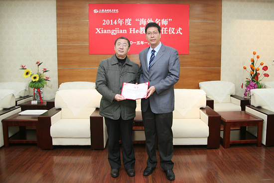 1月15日上午,我校在行政楼贵宾厅举行了海外名师聘任仪式,澳大利亚悉尼科技大学工程与信息学院Xiangjian He博士被聘为我校2014学年度“海外名师”,校长刘宇陆出席聘任仪式,并为Xiangjian He博士颁发聘任证书。国际交流处、计算机科学与信息工程学院负责人参加聘任仪式。