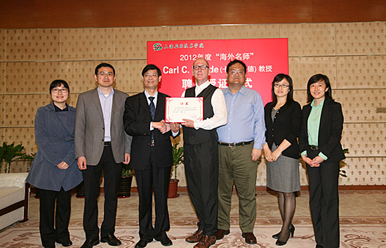 5月6日,我校已获批的2012学年度“海外名师”荷兰方提斯大学(FONTYS University)Carl C. Rohde(卡尔•罗德)教授受聘经济与管理学院,副校长叶银忠出席聘任仪式,为其颁发聘书,经济与管理学院、国际交流处等相关部门负责人参加仪式。