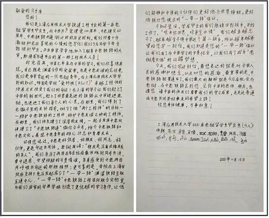 他们在信中表示:在中国共产党建党100周年、中老建交60周年、中老铁路开通倒计时的历史时刻,我们怀着十分激动和无比喜悦的心情向总书记汇报:9名同学今年全部顺利毕业,非常荣幸地加入了服务中老铁路的大军,即将成为通车后的第一批工程技术人员!回首几年来在中国的学习,我们欣喜地发现,自己既是澜湄合作的受益者,也是中老友谊的见证者。我们是非常幸运的一代老挝青年,在上海应用技术大学学到的知识,特别是学校“爱科技(ASciT)”卓越工程师的培养方式改变了我们的命运;在上海的学习让我们赶上了中国的新时代,赶上了世界最先进的铁路从中国连进老挝,也连进了我们每个人的心里。在那里,我们得到了无微不至的关怀指导,树立了做“两个工程师”的目标——维护中老铁路的工程师、维护中老友谊之桥的工程师。
